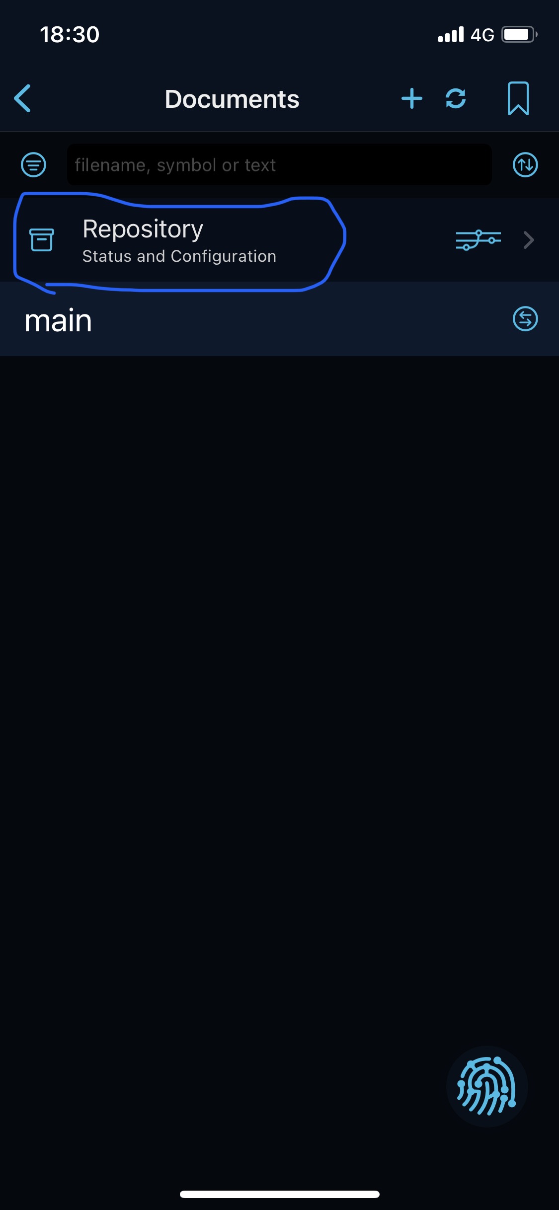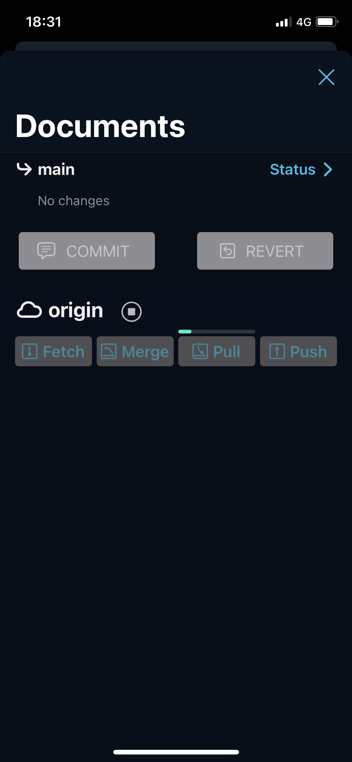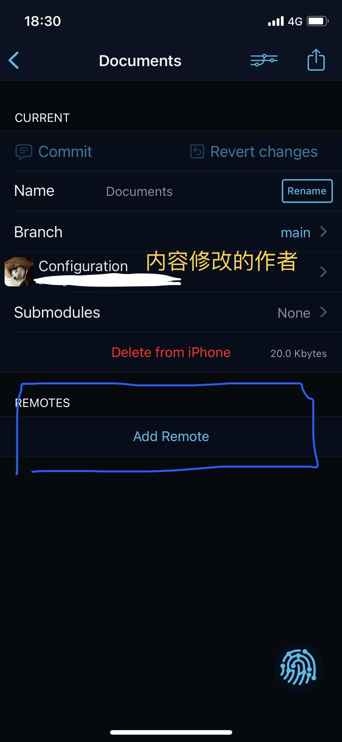 这个步骤非常简单,您在刚才的界面是否注意到了右下角的指纹图案的浮动按钮?这将是我们后续使用最多的按钮了,请记住它的样子。点击这个按钮,在弹出的界面中点击“Pull”(拉取远程更新),Working Copy 会从远程 Git 服务器下载您的内容,并存入映射目录中。下载完成后会出现一个顶部提示,包含了此次更新的内容概述。