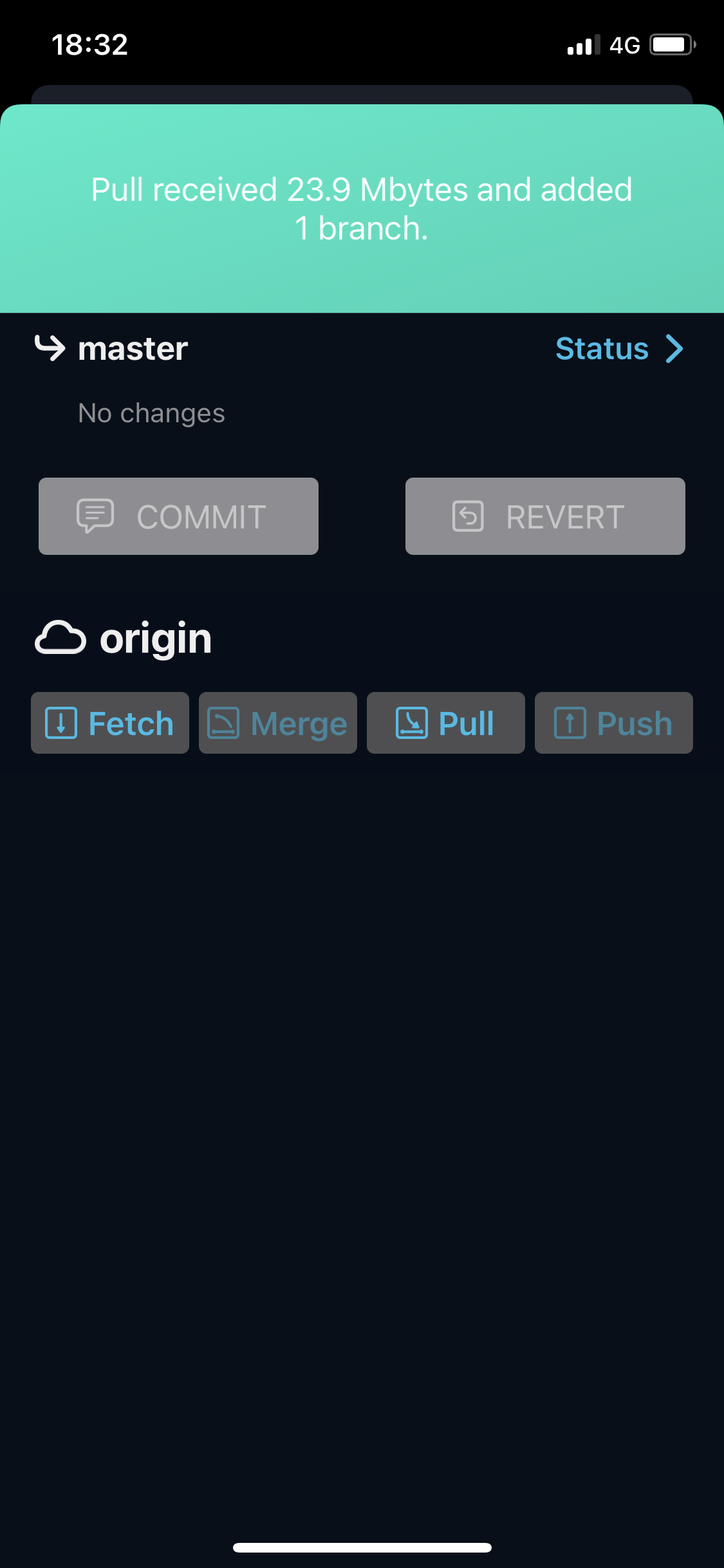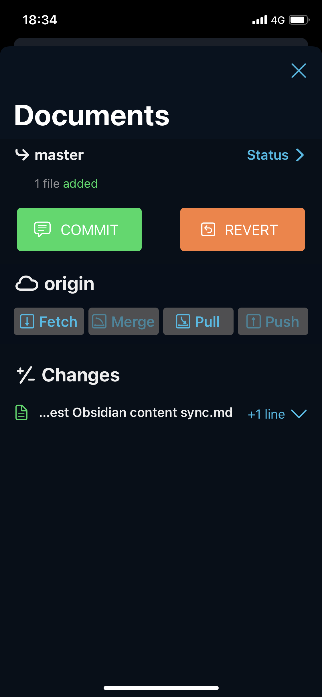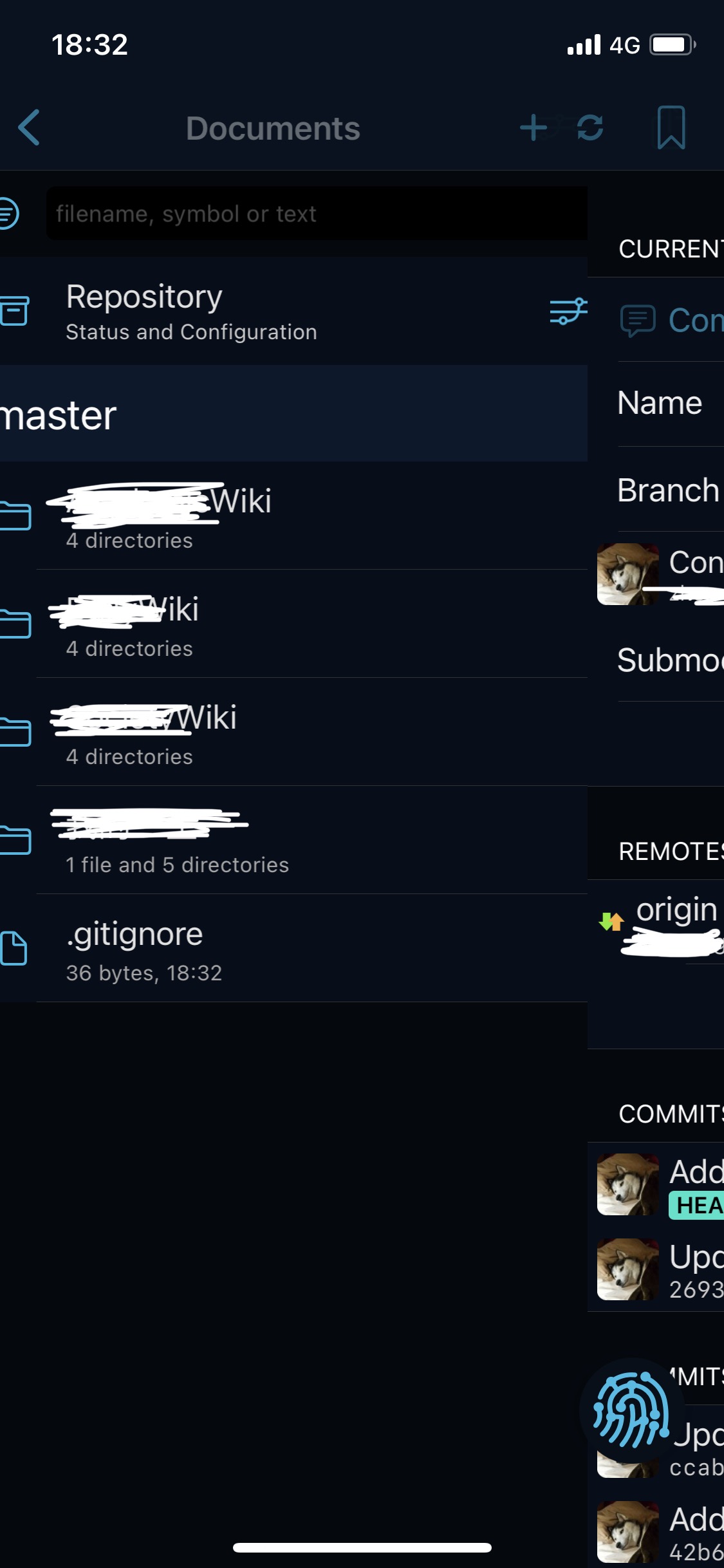 这个步骤非常简单,您在刚才的界面是否注意到了右下角的指纹图案的浮动按钮?这将是我们后续使用最多的按钮了,请记住它的样子。点击这个按钮,在弹出的界面中点击“Pull”(拉取远程更新),Working Copy 会从远程 Git 服务器下载您的内容,并存入映射目录中。下载完成后会出现一个顶部提示,包含了此次更新的内容概述。