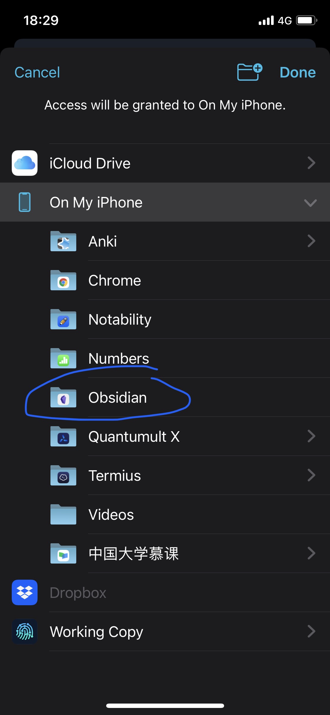 此时在弹出的界面中选择“On My iPhone”>“Obsidian”作为同步的目标目录。