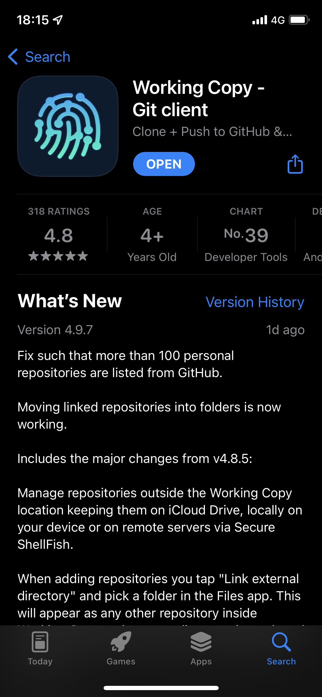 您需要在 iOS 设备上安装 Obsidian 和 Working Copy 两个应用。两者都可以通过 App Store 安装,其中 Working Copy 应用在商店里是这样的: