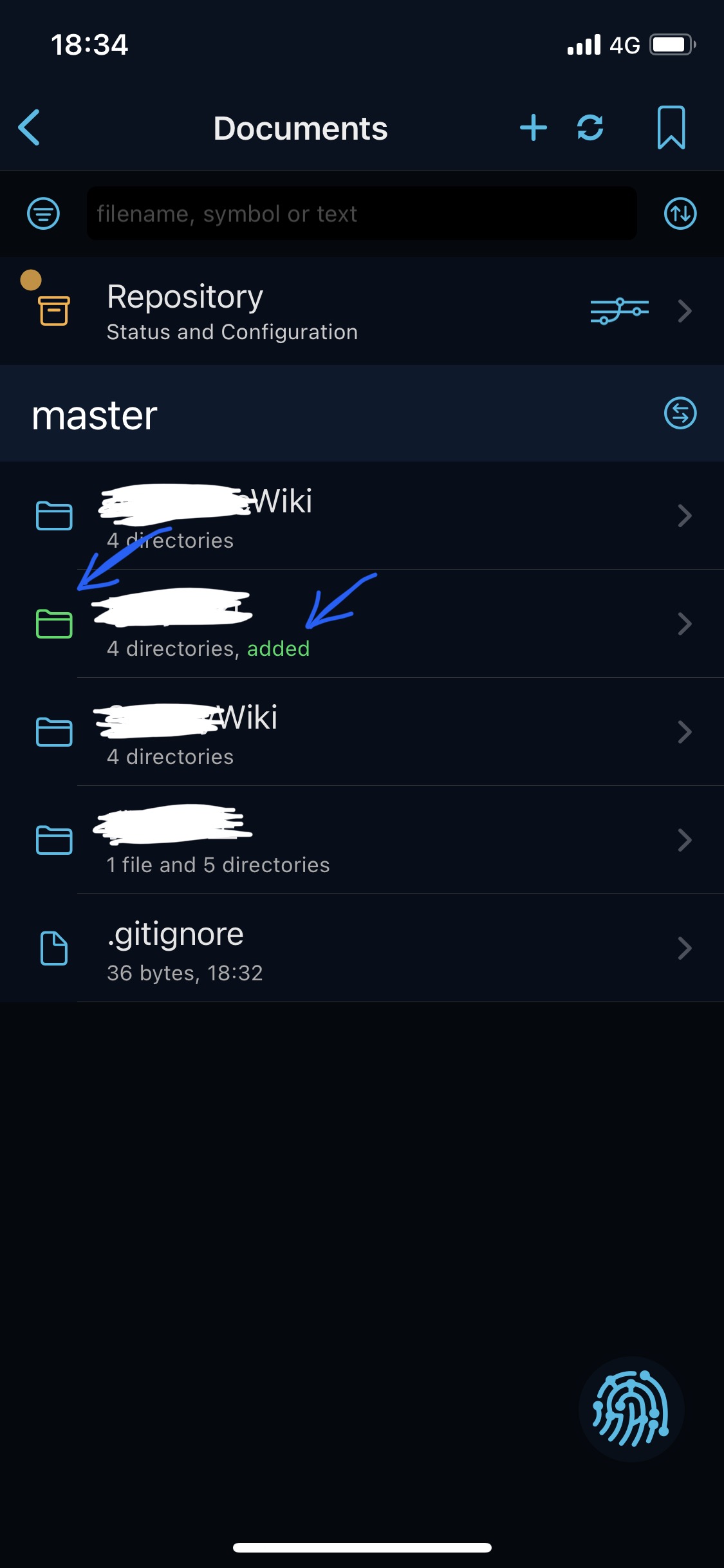 首先仍然是切换到 Working Copy 并进入刚才创建好的 Repository(名为“Documents”),可以看到发生内容编辑的 vault 对应的文件夹已经被标记成了绿色,内部也标志了“added”字样5。